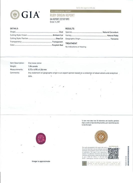 GIA Certified Natural Ruby 1.04CT Unheated from Tanzania